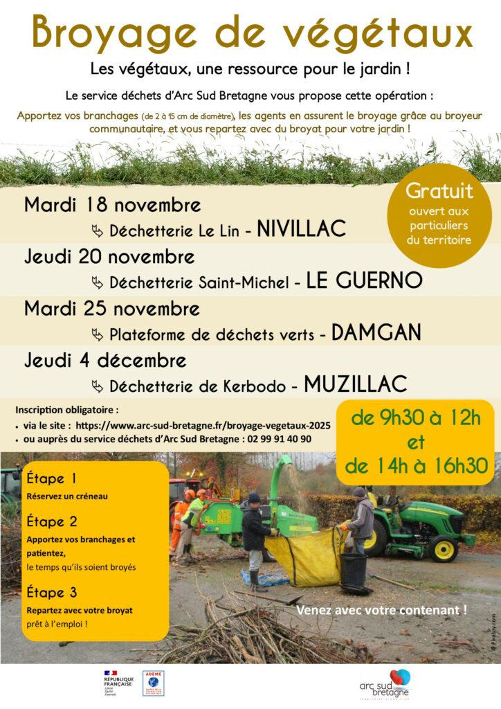 Sur inscription en s’inscrivant en ligne via le site internet de la CommunautĂ© de Communes https://www.arc-sud-bretagne.fr/broyage-vegetaux-2025/