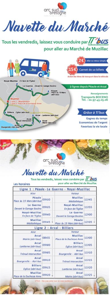 La navette « Tiâbus » mise en place par Arc Sud Bretagne vous permet de venir Ă Muzillac tous les vendredis matin, notamment pour le marchĂ© hebdomadaire, au dĂ©part de Le Guerno!